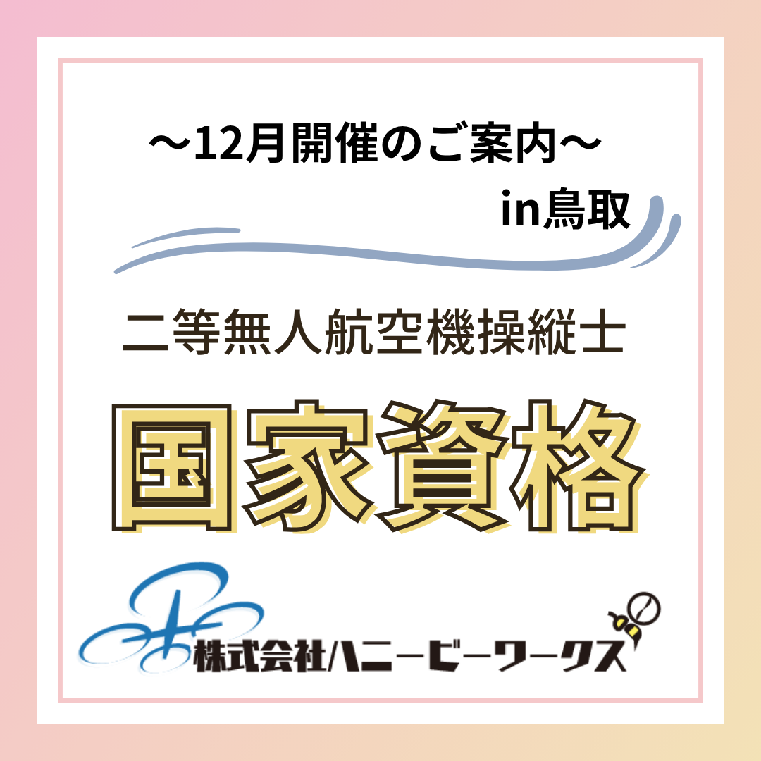次回の【鳥取ドローンスクール】 紅葉が色濃くなり、秋の風景が美しい時期ですね。お変わりございませんか。 弊社ハニービーワークスでは鳥取でもドローンスクールを開催しています。 次回は12月1日(月)~2日(火)に開催します 今年最後の講習になります。 ドローンに興味をお持ちの方🎵 仕事で必要な方🎵 国家資格に興味を持たれている方🎵...