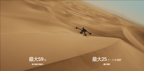 Matrice 400は優れた飛行能力を有し、ペイロードを追加した状態でも最大59分間の飛行と最大53分間のホバリングが可能です。捜索救助、消防、大規模測量などの長期連続運用において、頼りになる存在です。また、最大25m/秒の飛行速度で、建物や山などの大きな障害物を回避することも可能となっています。