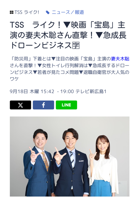 ドローンブログ 【TSS テレビ新広島】TSSライク 【TSS テレビ新広島】TSSライク 先日【TSS テレビ新広島】がドローンについて取材に来られ 本日9月18日17時15分頃から放送せれそうです。 うちの社長がドローンについてお話をさせていただきました♡ TSSライクでは本日妻夫木聡さん直撃取材も放送されるそうです。 これは、見るしかないですね!! 是非、ご覧ください! お気になる方は🐝 ドローンのことなら広島ドローンスクール ハニービーワークスのスタッフまでお問い合わせください‼️ tagPlaceholderカテゴリ: ドローンブログ コメントをお書きください コメント: 0