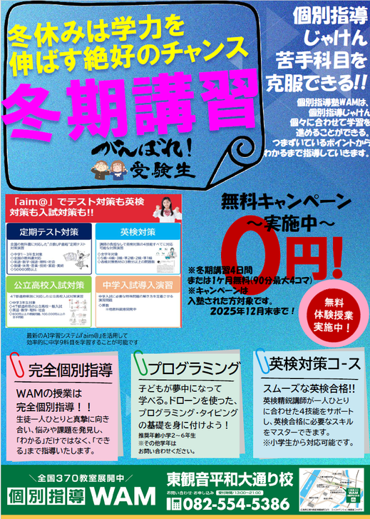 今年の冬期講習では、生徒の皆さんが新年に向けてしっかりと学力を伸ばせるよう、基礎の総復習から実践的な応用問題まで、充実した内容をご用意しております。